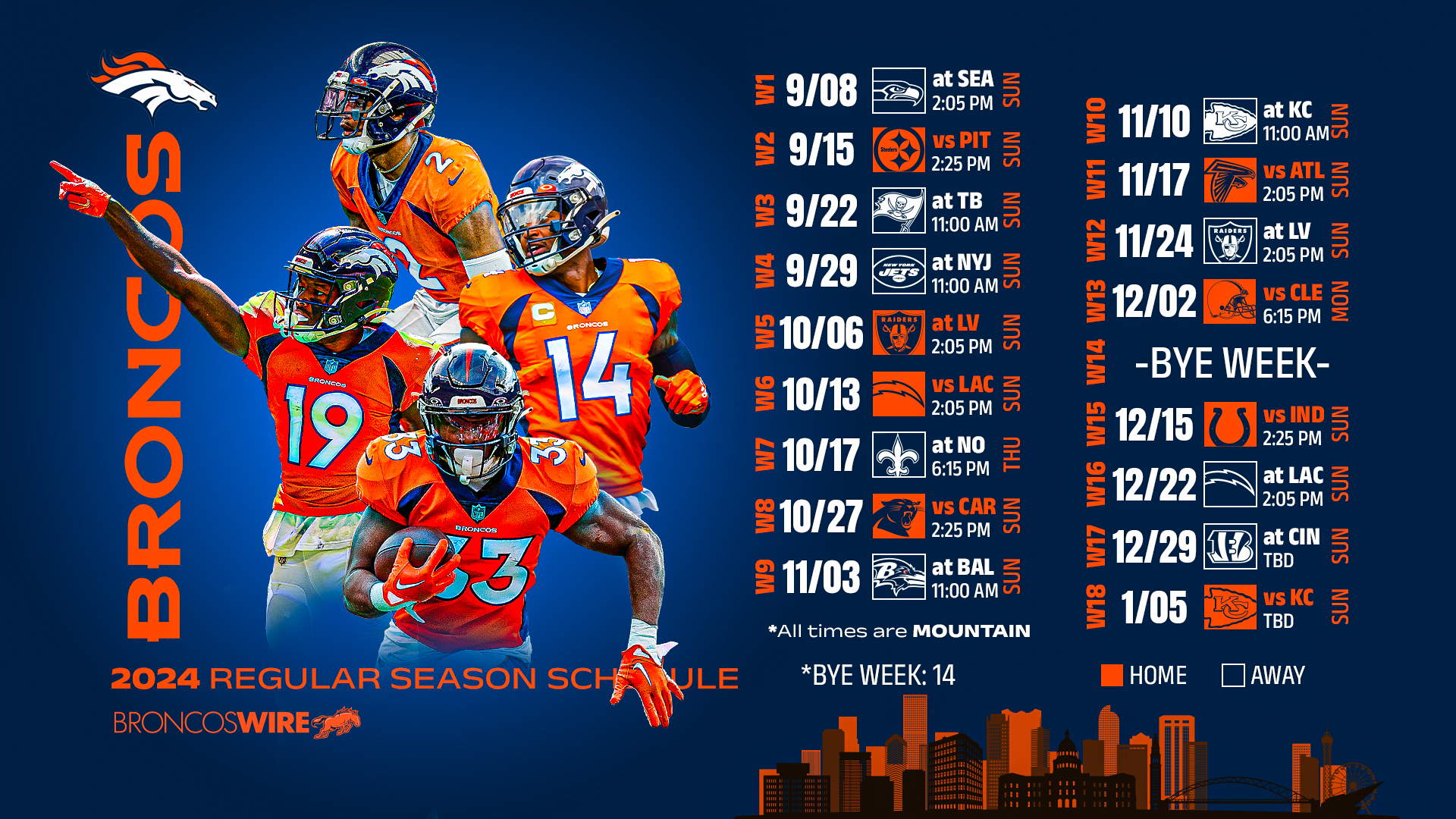 Courtesy of the NFL Wire Network’s Coley Cleary, here is a horizontal Broncos schedule wallpaper (click here to view a larger version).